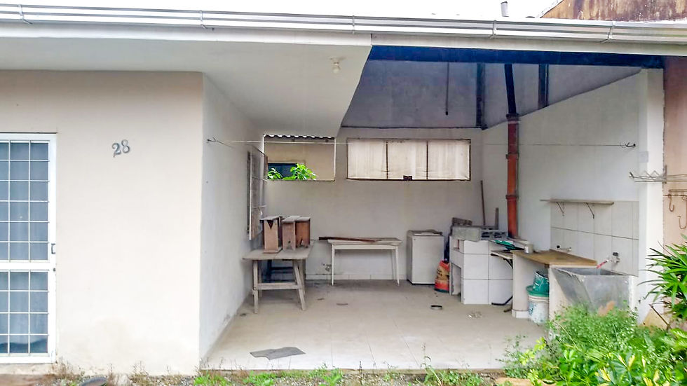 mais um banheiro, sala e cozinha conjugadas e varanda com fogão a lenha.